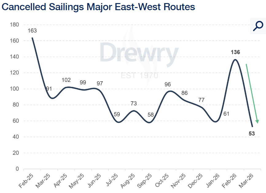 To manage the traditional seasonal drop in cargo during the holidays, carriers have aggressively reduced their active capacity. Across the major trades, including Asia-Europe, 136 scheduled sailings were cancelled for February. This represents a massive 122% increase in blank sailings compared to January. Looking ahead to March, the strategy shifts. Currently, only 53 blank sailings have been announced, which will translate to an effective capacity increase of 20% for the month.