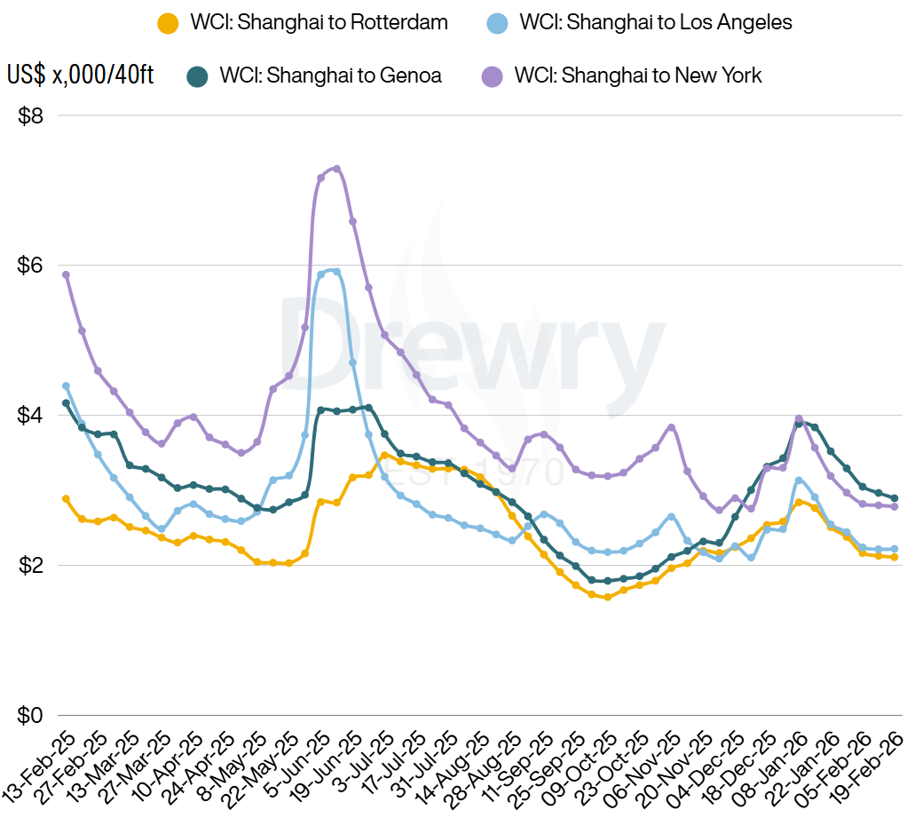 As the Chinese New Year holidays wrap up, operations in China are still slowly getting back up to speed. Our internal data shows that a significant number of containers were left behind before the break, which is currently restricting the available space for new bookings. Due to this tighter capacity, we anticipate a slight upward pressure on rates in the short term, although exact market indications have not yet been fully established.